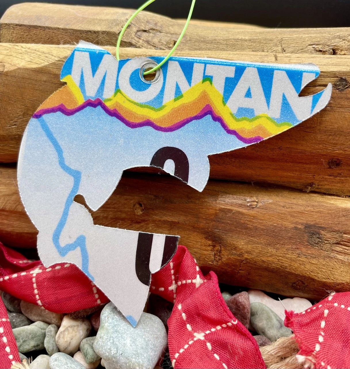 Compliment your holidays with a handmade Montana Colorful Jumping Trout ornament made out of authentic license plates. Each piece is artfully unique due to using a variety of license plates, and is tied with a colorful fly line. This is a great holiday ornament, gift accessory, or accent piece for the fishing enthusiast. These fish are a limited edition and sell fast, so please place your orders today.
