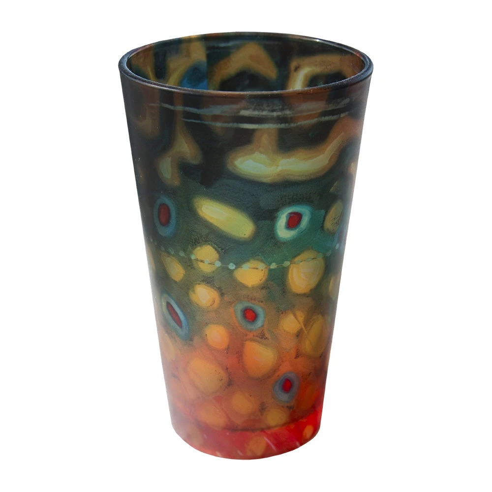 These heavy duty, 16 oz. Pilsner glasses showcase the best of DeYoung’s Abstract Fish Flank Series in a beautiful fully wrapped print within the glass. Available in Tarpon, Brown, Brook, Rainbow and Cutthroat. Buy as singles or as sets. Microwave safe, but not dishwasher recommended. Printed in the USA.