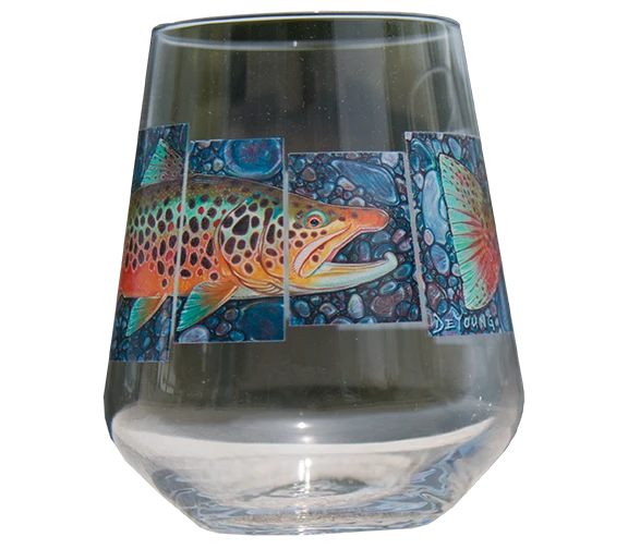 Sit back, relax and enjoy a glass of Cabernet in our elegant 14 oz. Stemless Wine Glasses. They feature a beautiful fully wrapped band of DeYoung Brown Trout or Tarpon artwork (printed with eco-friendly Organic inks) around the glass. The bowl of this glass tapers to a smaller mouth which helps concentrate aromatics, making for a fuller, exceptional drinking experience. This glass has proven to be popular as craft beer glassware as well, thanks to its unique shape. Buy in singles or as sets. Not dishwasher recommended. Printed in the USA.