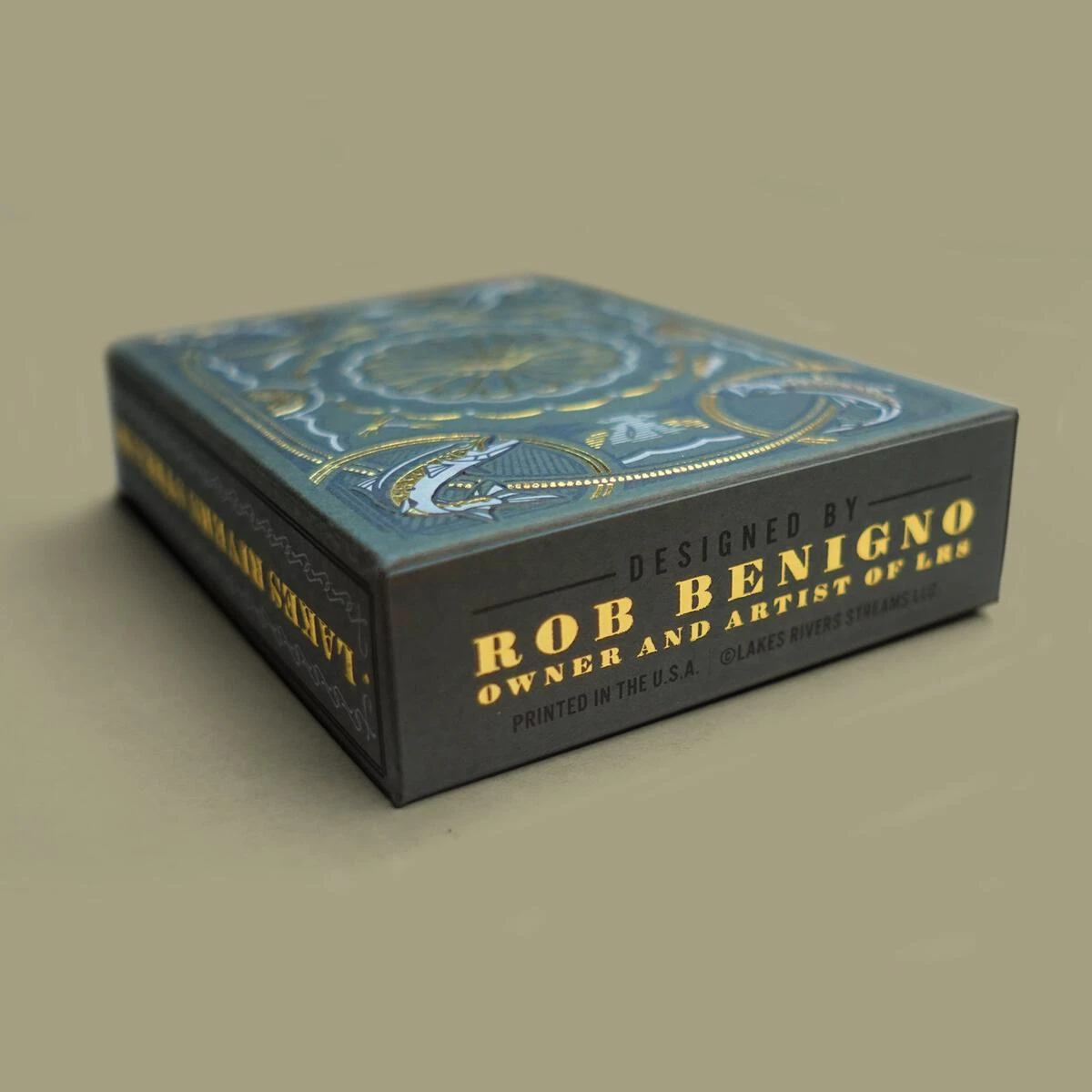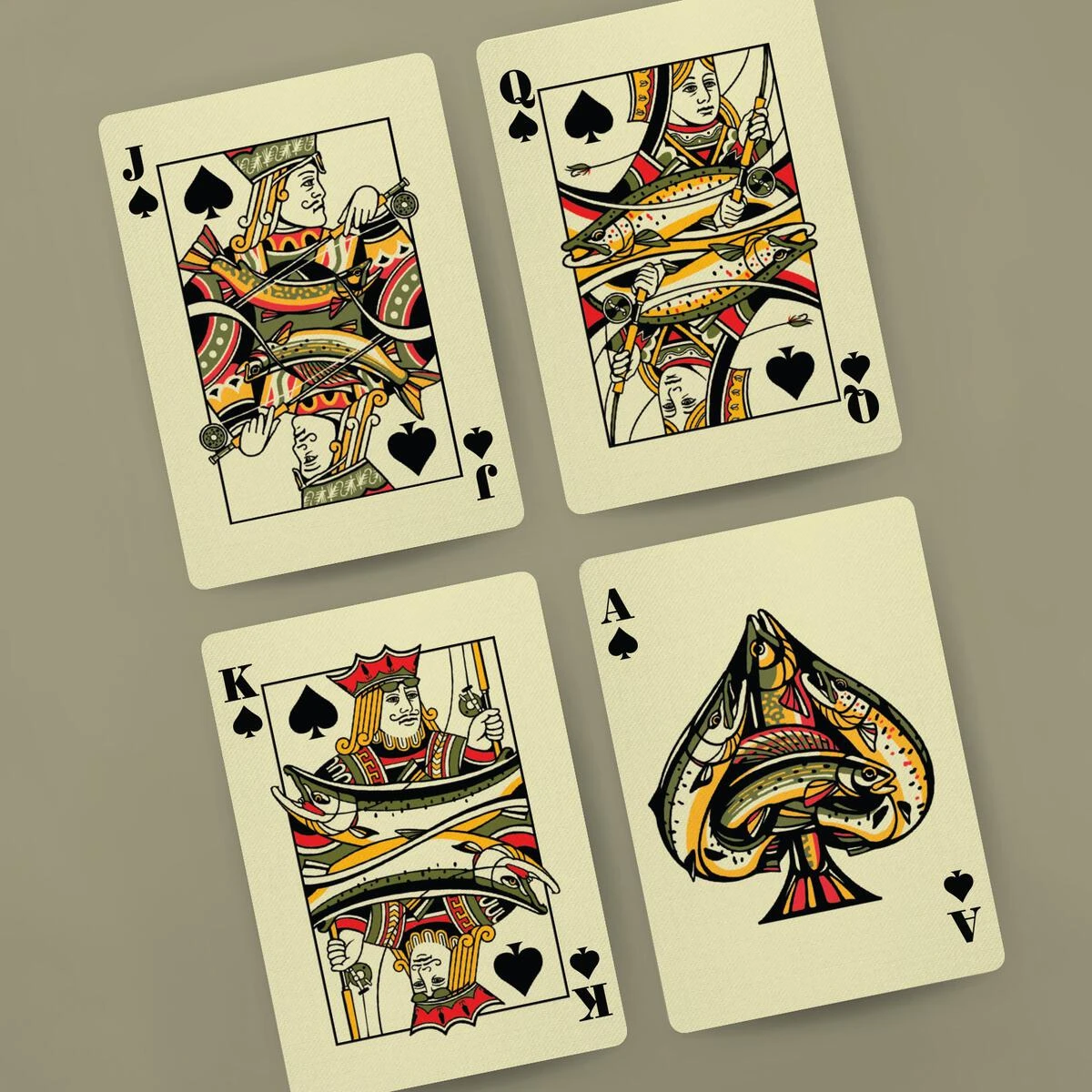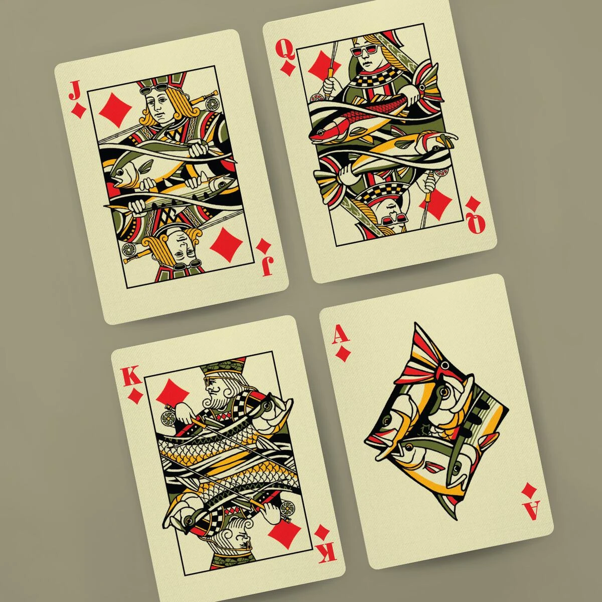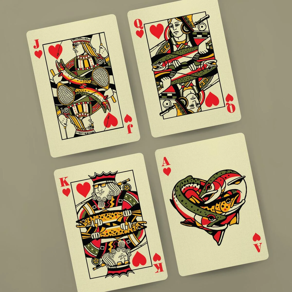 Back in October of 2021 I decided to draw a King of Hearts and see if there’s was interest in drawing a whole deck. After seeing the overwhelming response of people wanting to see the deck completed, I decided to say heck with it and jump in headfirst. For about a year and some change, I drew and designed every aspect of this deck. From the tuck box embellished with gold leaf and embossment, to the card backs, to the court cards and even down to subtle details in the symbols on the number cards, nothing on this deck was overlooked. This is the perfect deck to bring to camp, or play with friends or family on poker night, or gift to anyone you know who loves cards and fishing.