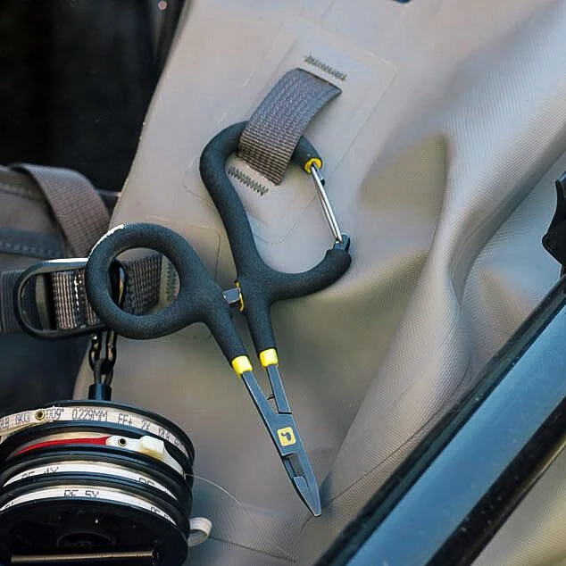 The ultimate hemostat, thoughtfully designed from the tips to the jaws to the handle.  A carabiner handle means you can store anywhere and the tight angles and engineered shape accommodate all fly sizes, allow for easy hook removal, and can crimp even the heaviest of barbs. Oversized thumb and finger holes accommodate large or gloved hands, and the compact cutting surface easily clips light or heavy leader.