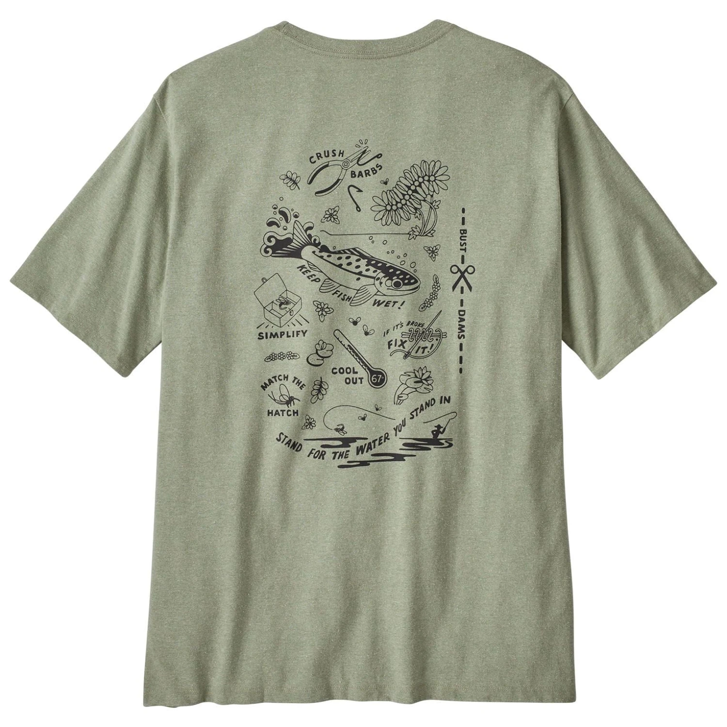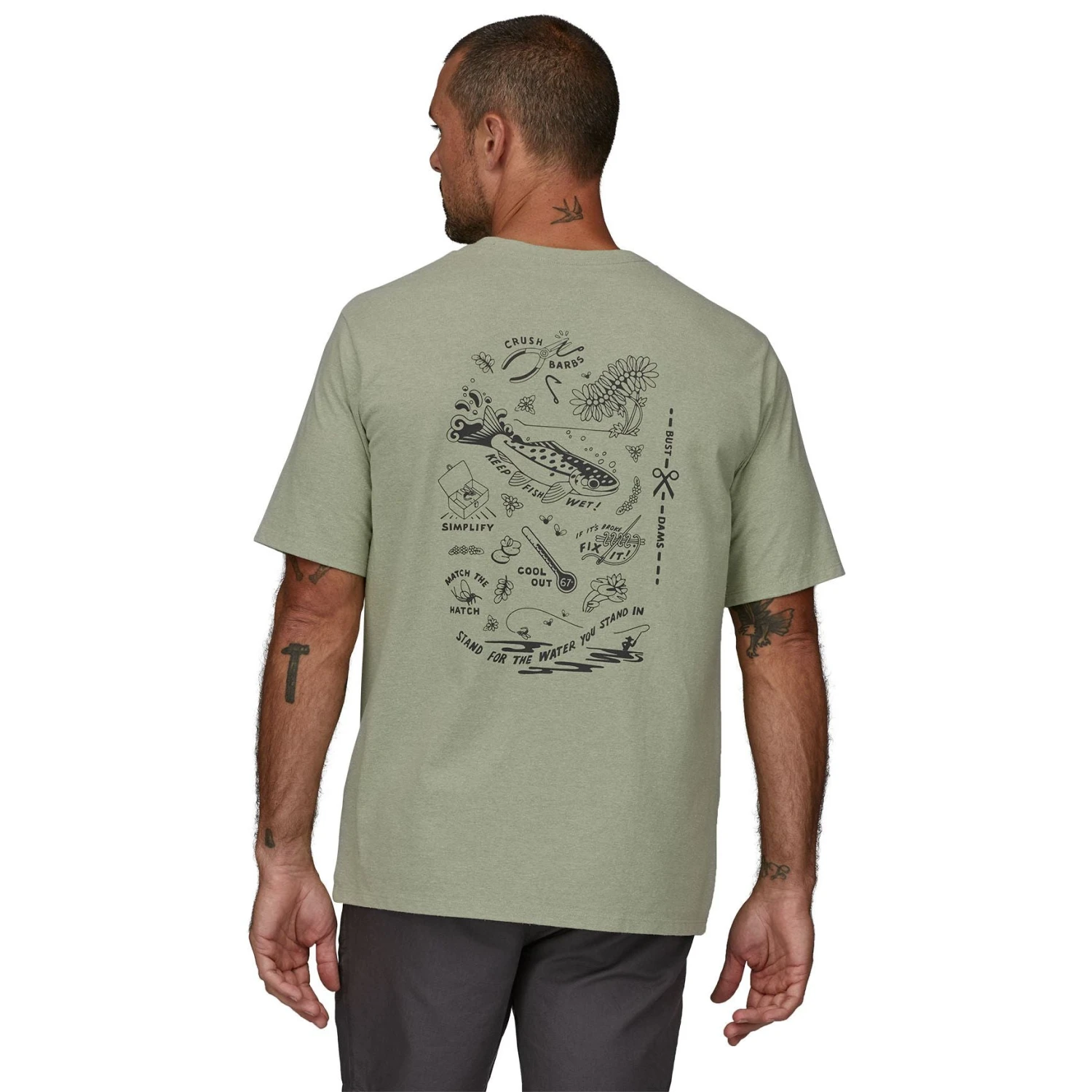 Stand for the water you stand in. Our Action Angler artwork illustrates actions large and small that will help ensure a fishable future for everyone. The graphic is screen-printed on a T-shirt made of 100% postconsumer recycled fabric. By utilizing fabric scraps and recycled bottles, we reduce our reliance on virgin raw materials. Fair Trade Certified™ sewn.