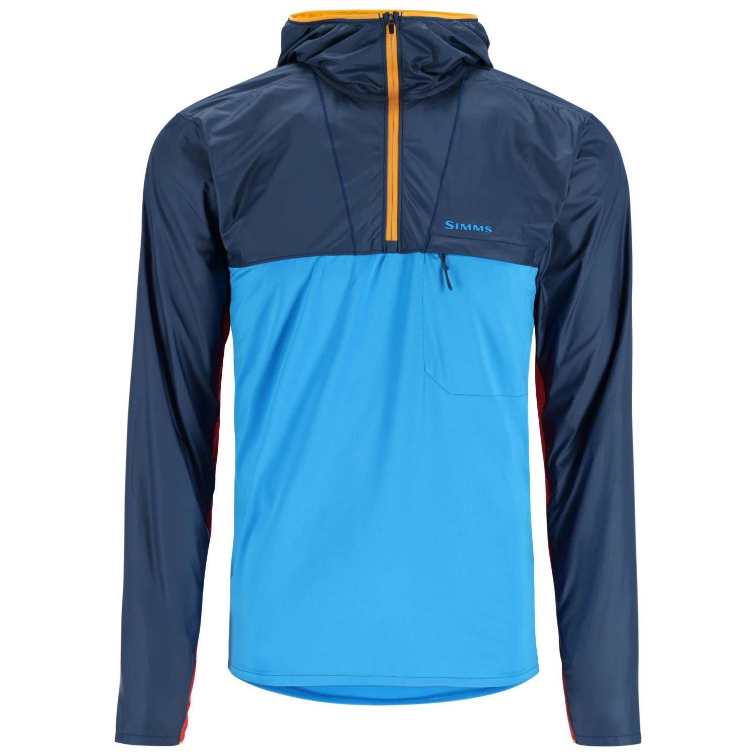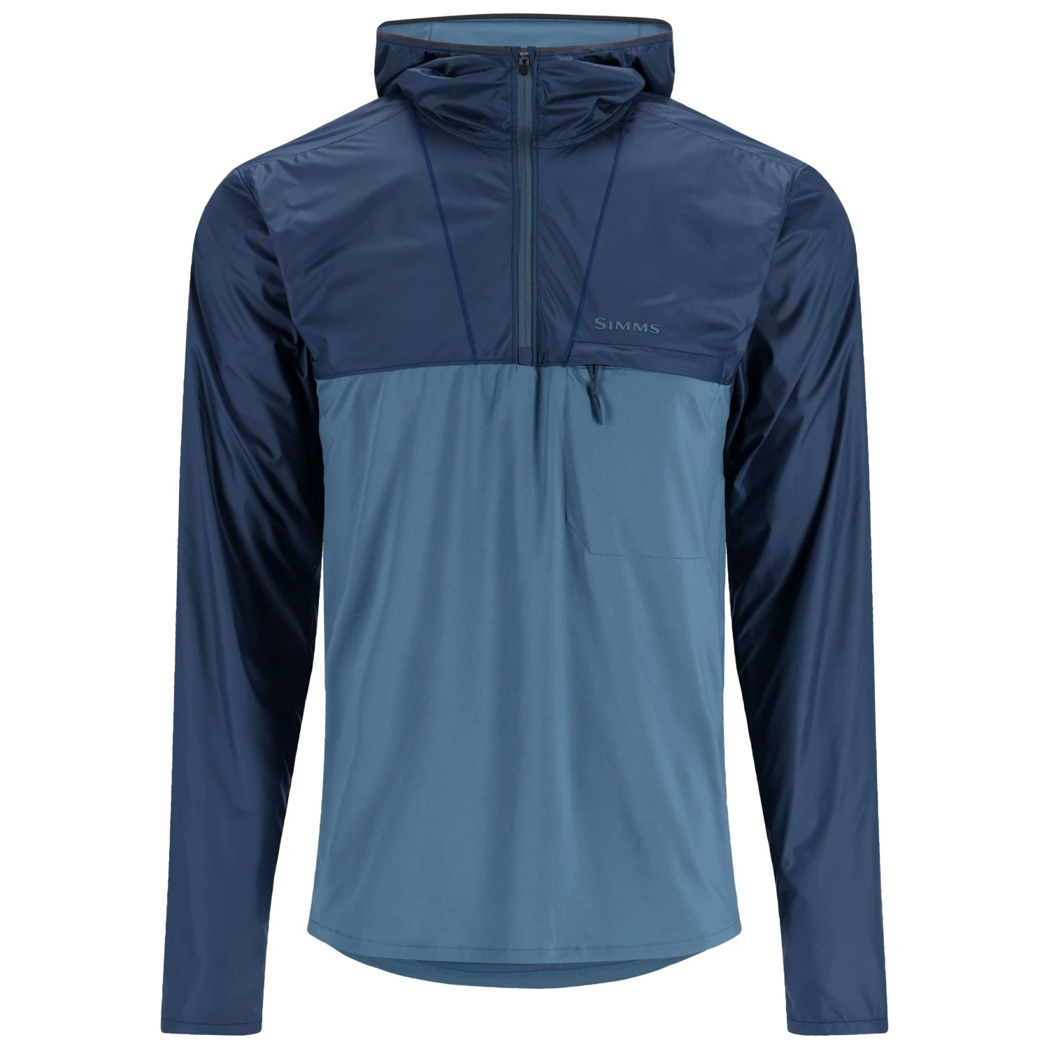 - 3-panel hood designed for sun protection overlaid with wind block ripstop material. Quarter length center front zipper and horizontal zippered left chest pocket for essentials.